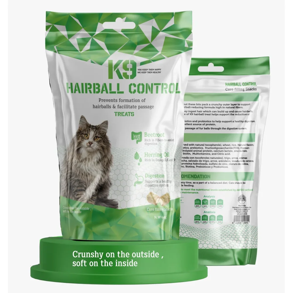 K9 Hairball Control Treats provide a functional solution for a common feline concern. Utilizing specialized core-filling technology, these snacks offer a satisfying outer crunch that helps support dental hygiene, paired with a soft, nutrient-dense center. Formulated with high-fiber ingredients, these treats assist in moving ingested hair through the digestive tract to reduce the frequency of hairball formation.